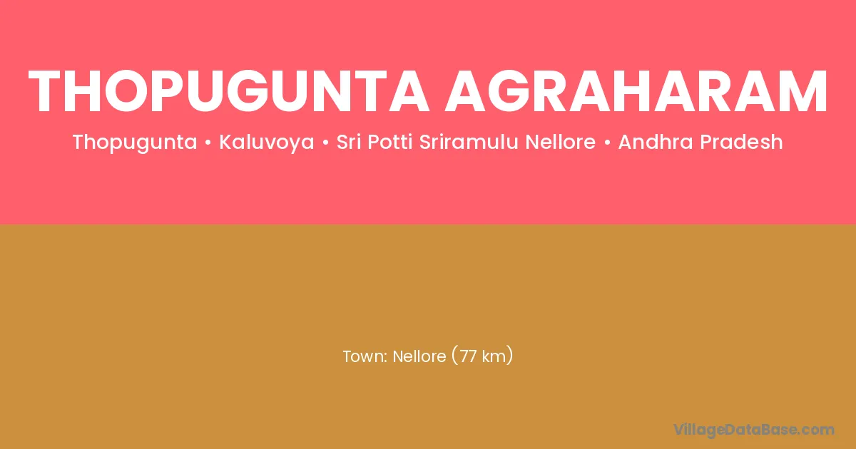 Nellore (77 km) is the nearest town to Thopugunta Agraharam village for major economic activities and is located approximately 77 km away.