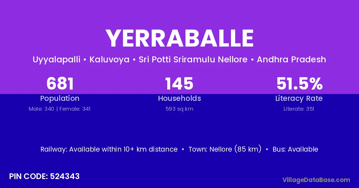 Nellore (85 km) is the nearest town to Yerraballe village for major economic activities and is located approximately 85 km away.