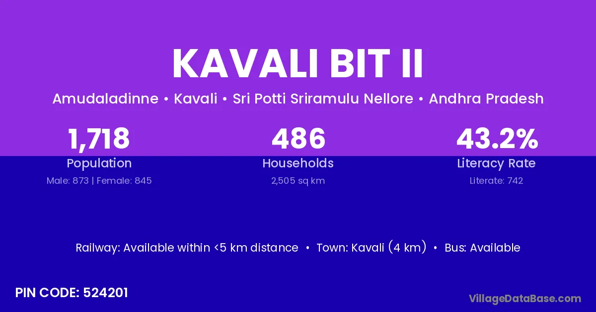 Kavali Bit Ii village has a total population of 1,718 people, of which 873 are males and 845 are females.