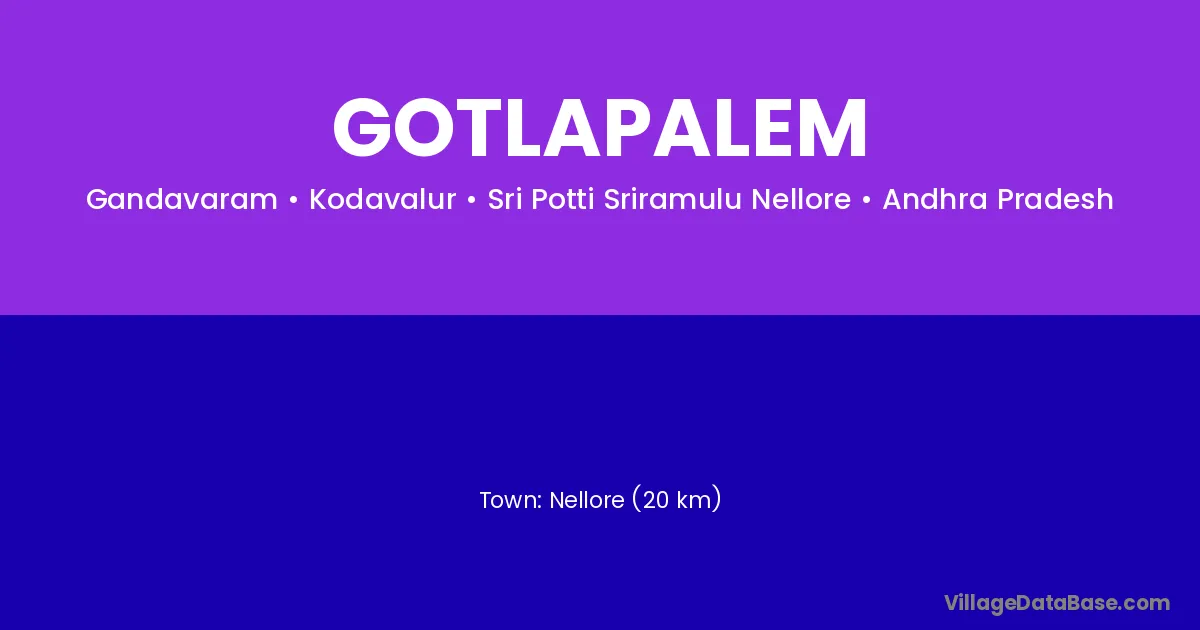 Nellore (20 km) is the nearest town to Gotlapalem village for major economic activities and is located approximately 20 km away.