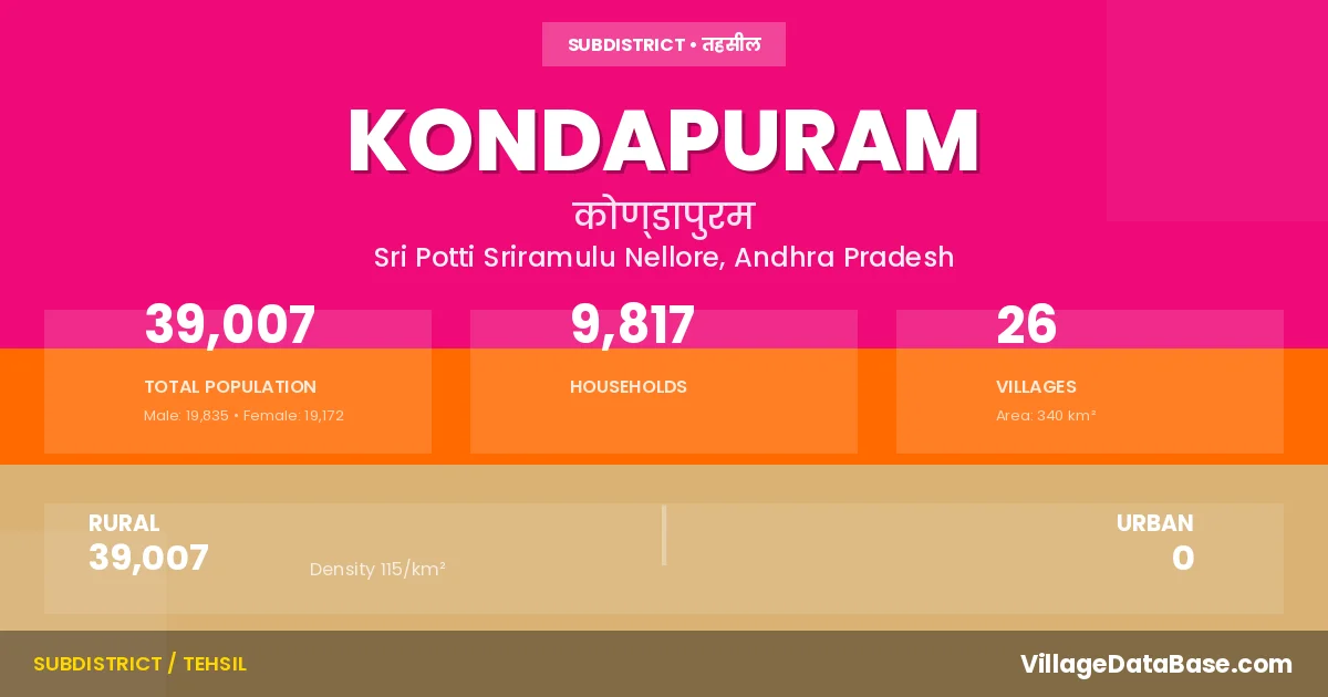 Kondapuram is a town and Mandal in the Sri Potti Sriramulu Nellore district of the Andhra Pradesh. In India, a Mandal is a subdivision of a district responsible for the administration and revenue collection of a specific area within the district. Mandals play a crucial role in the local governance structure, contributing significantly to the development and administration of their communities.