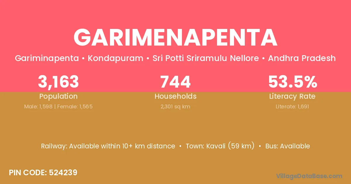 Kavali (59 km) is the nearest town to Garimenapenta village for major economic activities and is located approximately 59 km away.