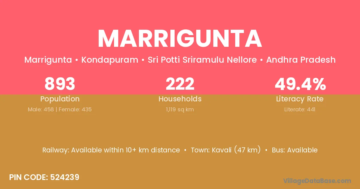 Kavali (47 km) is the nearest town to Marrigunta village for major economic activities and is located approximately 47 km away.
