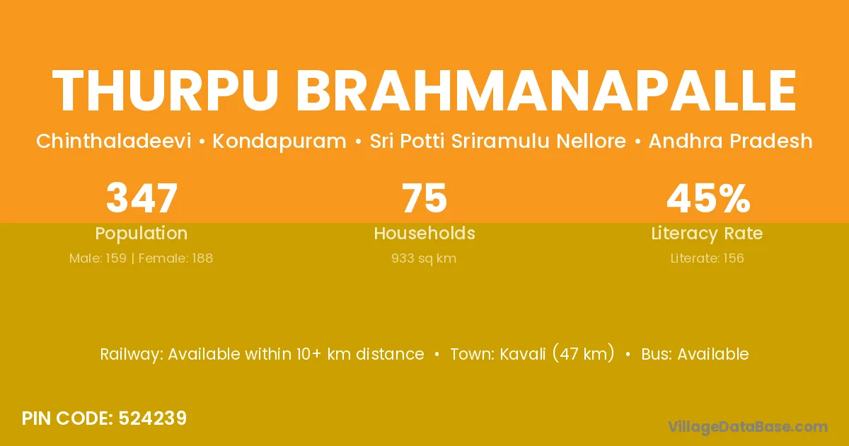 Thurpu Brahmanapalle village has a total population of 347 people, of which 159 are males and 188 are females.