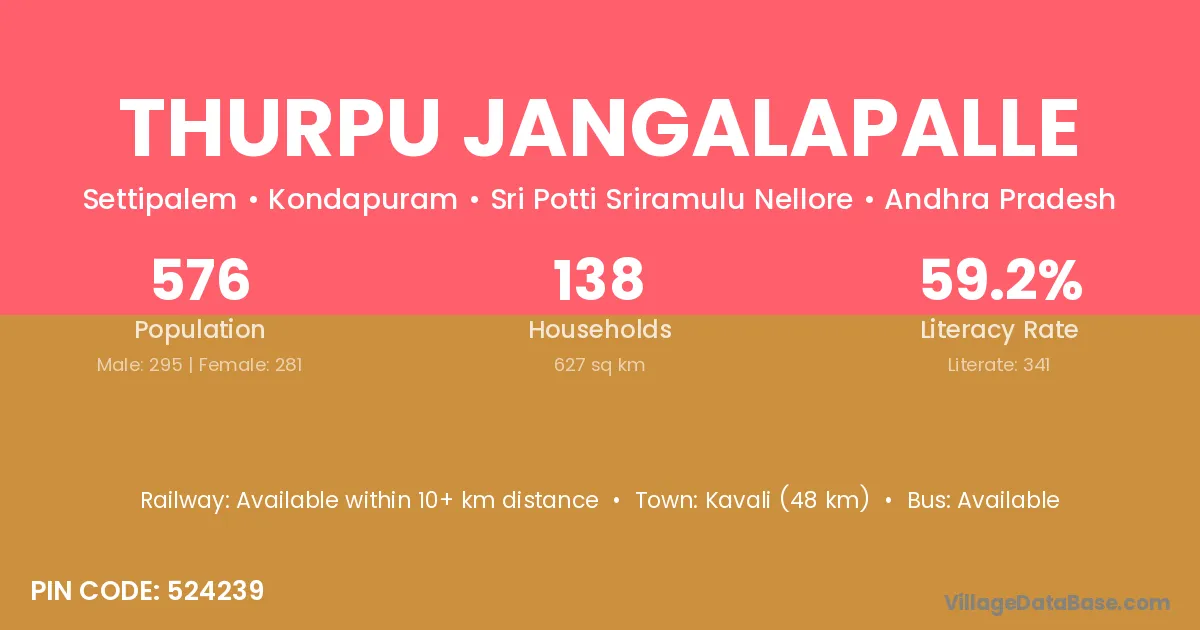 Thurpu Jangalapalle village has a total population of 576 people, of which 295 are males and 281 are females.