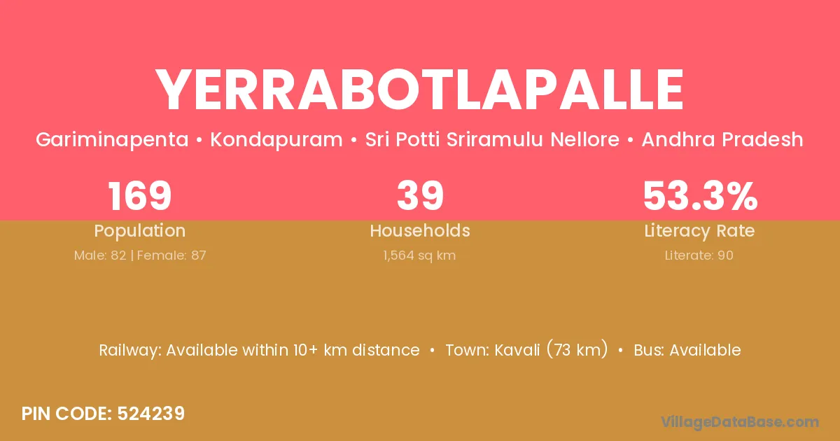 Kavali (73 km) is the nearest town to Yerrabotlapalle village for major economic activities and is located approximately 73 km away.