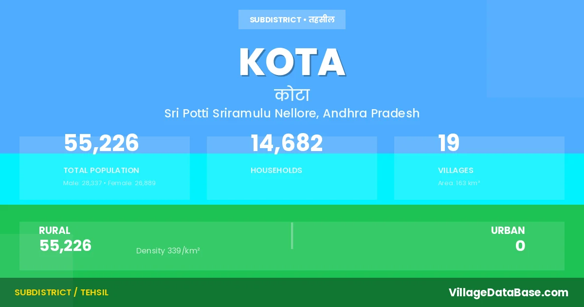 Kota is a town and Mandal in the Sri Potti Sriramulu Nellore district of the Andhra Pradesh. In India, a Mandal is a subdivision of a district responsible for the administration and revenue collection of a specific area within the district. Mandals play a crucial role in the local governance structure, contributing significantly to the development and administration of their communities.
