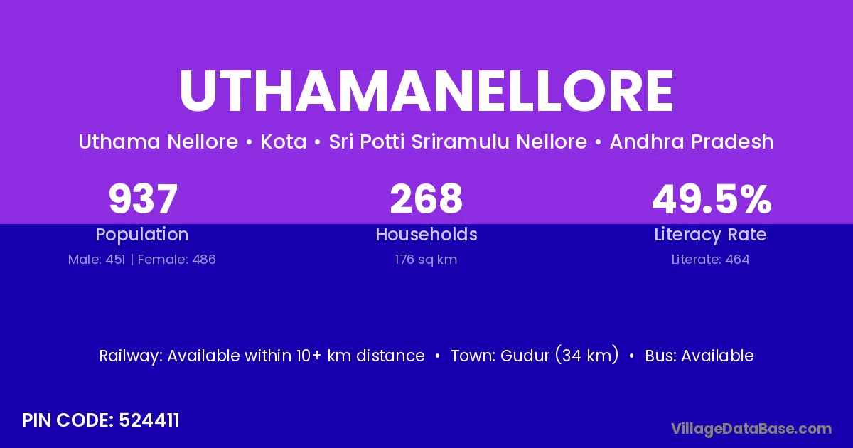 Gudur (34 km) is the nearest town to Uthamanellore village for major economic activities and is located approximately 34 km away.