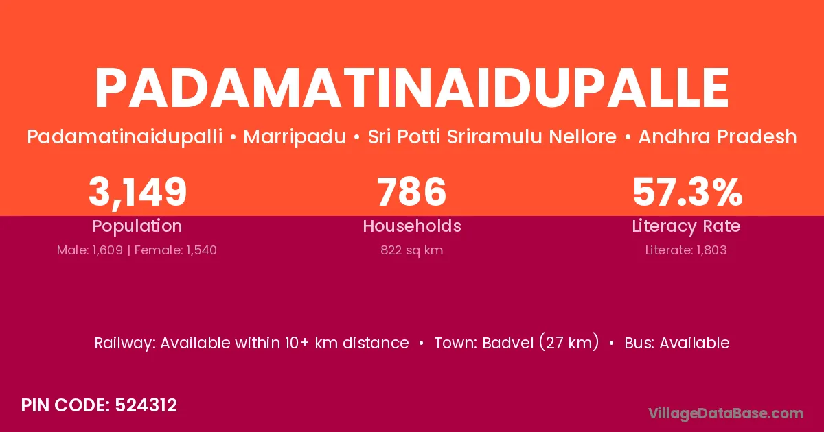 Badvel (27 km) is the nearest town to Padamatinaidupalle village for major economic activities and is located approximately 27 km away.