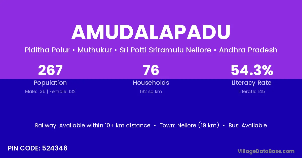 Nellore (19 km) is the nearest town to Amudalapadu village for major economic activities and is located approximately 19 km away.