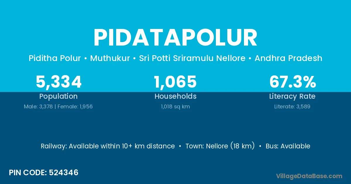 Nellore (18 km) is the nearest town to Pidatapolur village for major economic activities and is located approximately 18 km away.