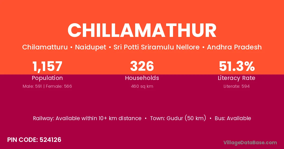 Gudur (50 km) is the nearest town to Chillamathur village for major economic activities and is located approximately 50 km away.