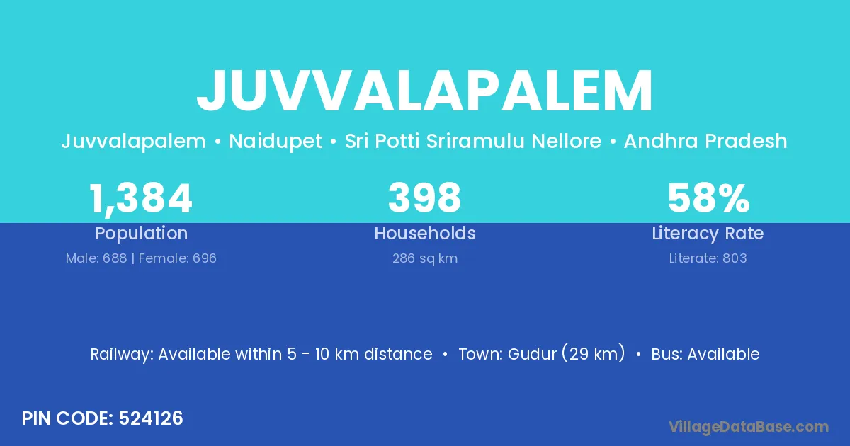 Gudur (29 km) is the nearest town to Juvvalapalem village for major economic activities and is located approximately 29 km away.