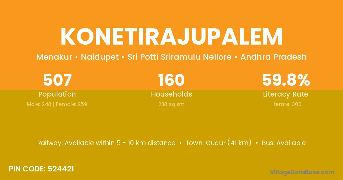 Gudur (41 km) is the nearest town to Konetirajupalem village for major economic activities and is located approximately 41 km away.