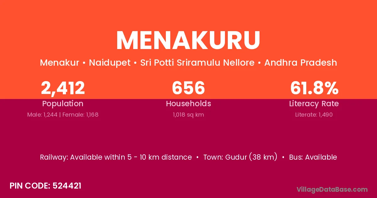 Gudur (38 km) is the nearest town to Menakuru village for major economic activities and is located approximately 38 km away.
