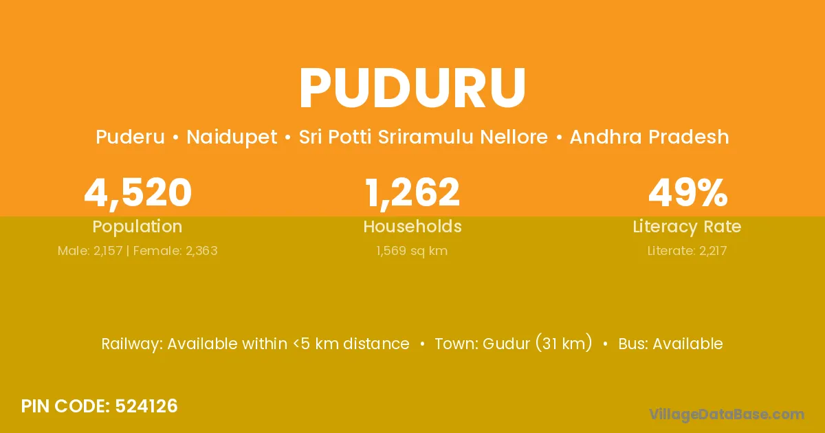 Gudur (31 km) is the nearest town to Puduru village for major economic activities and is located approximately 31 km away.