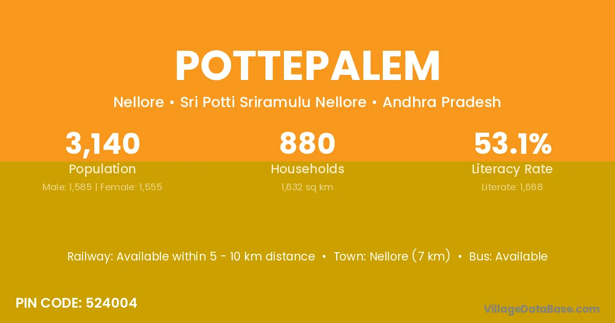 Nellore (7 km) is the nearest town to Pottepalem village for major economic activities and is located approximately 7 km away.