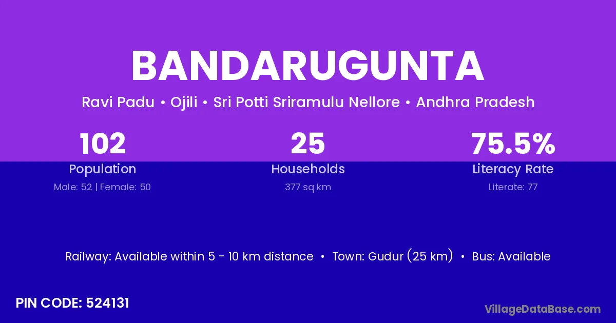 Bandarugunta village has a total population of 102 people, of which 52 are males and 50 are females.