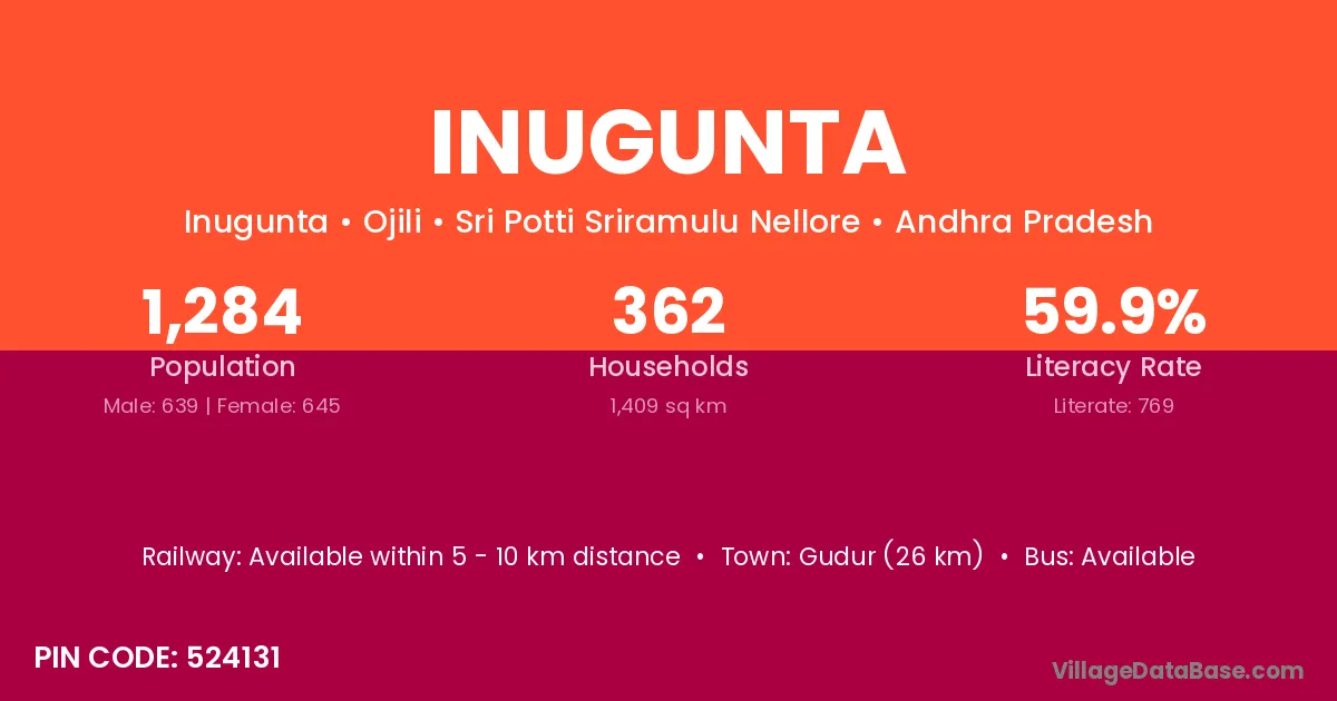 Gudur (26 km) is the nearest town to Inugunta village for major economic activities and is located approximately 26 km away.