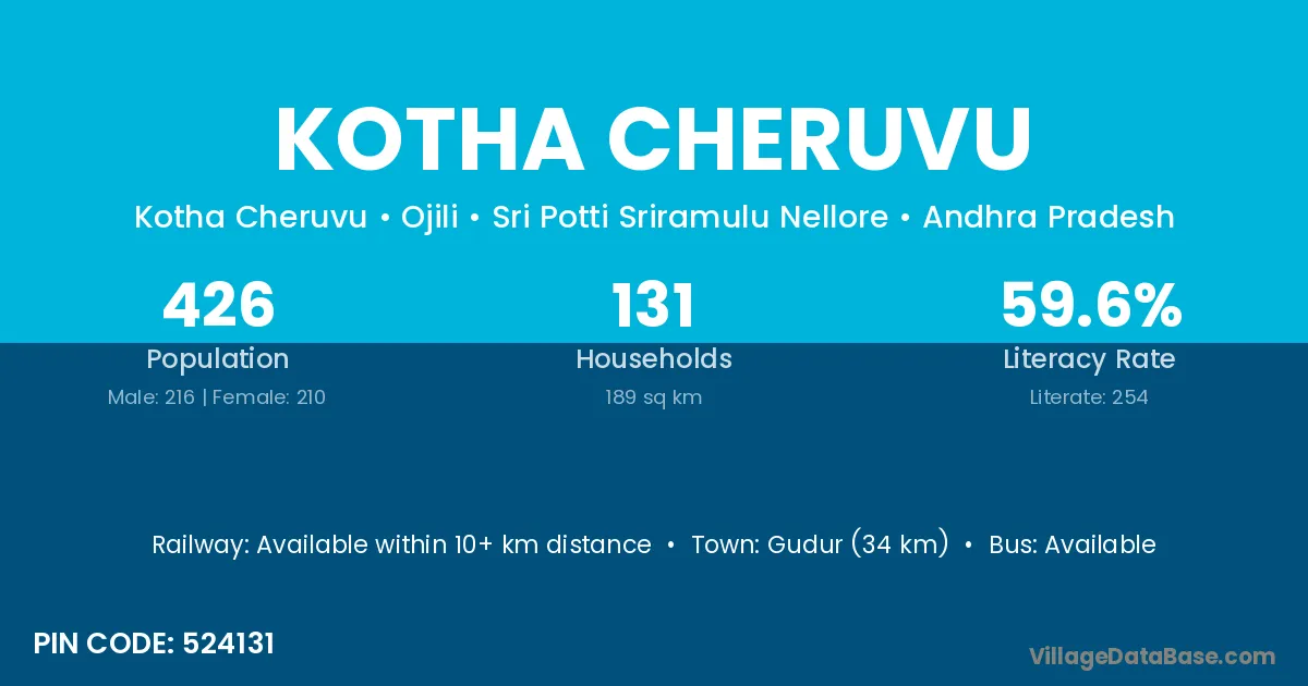 Kotha Cheruvu village has a total population of 426 people, of which 216 are males and 210 are females.