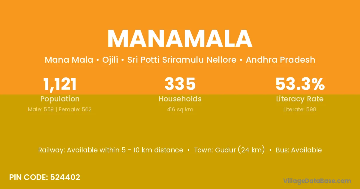 Gudur (24 km) is the nearest town to Manamala village for major economic activities and is located approximately 24 km away.