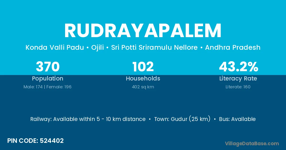 Gudur (25 km) is the nearest town to Rudrayapalem village for major economic activities and is located approximately 25 km away.