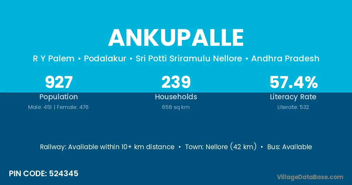 Nellore (42 km) is the nearest town to Ankupalle village for major economic activities and is located approximately 42 km away.