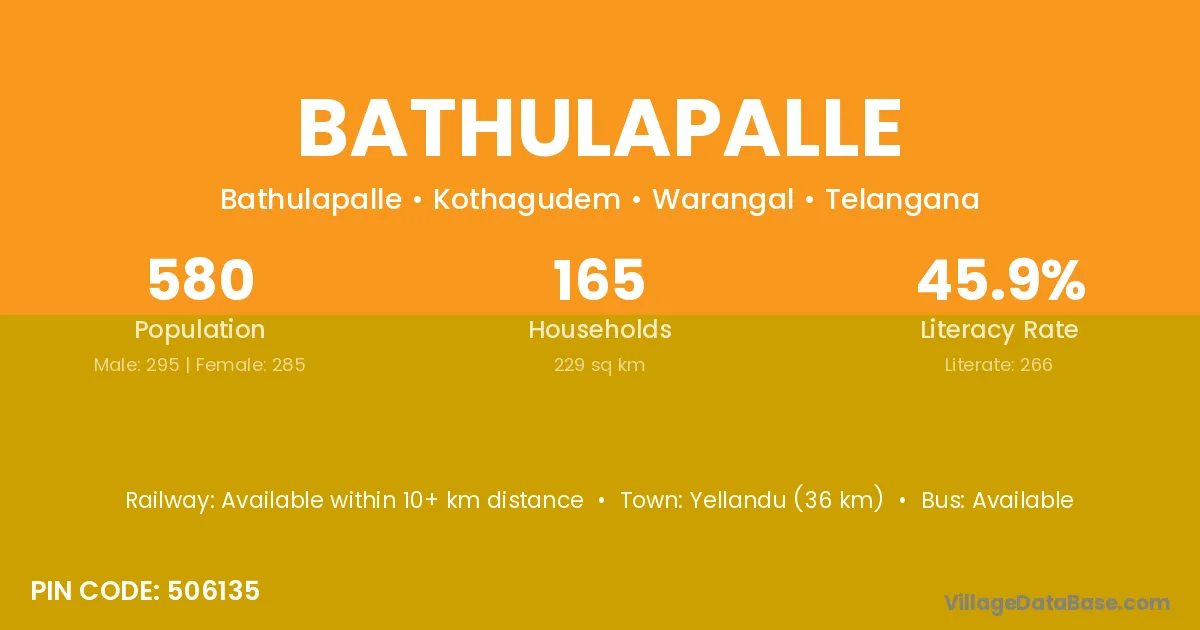 The literacy rate of Bathulapalle village is 62.09%. Male literacy stands at 68.55% and female literacy at 56.06%.