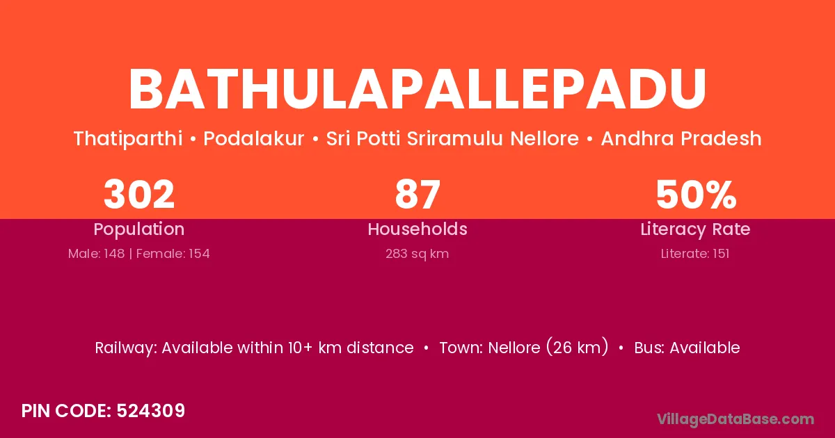 Nellore (26 km) is the nearest town to Bathulapallepadu village for major economic activities and is located approximately 26 km away.