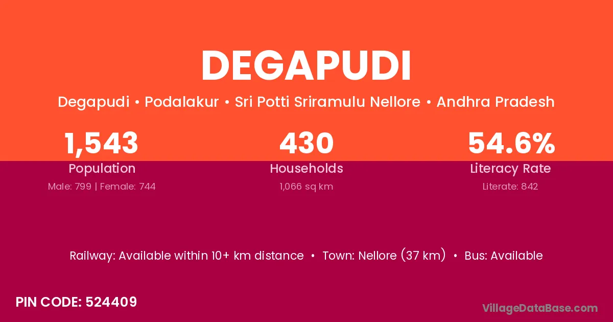 Nellore (37 km) is the nearest town to Degapudi village for major economic activities and is located approximately 37 km away.