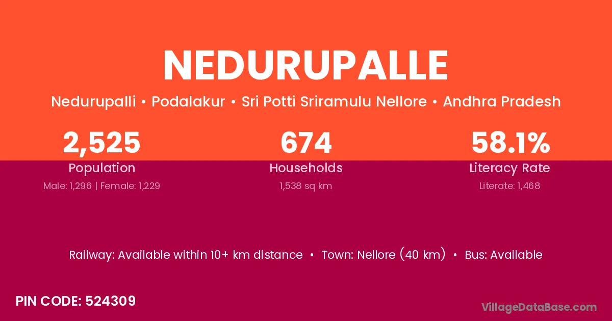 Nellore (40 km) is the nearest town to Nedurupalle village for major economic activities and is located approximately 40 km away.