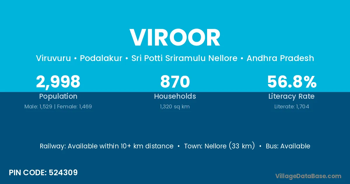 Nellore (33 km) is the nearest town to Viroor village for major economic activities and is located approximately 33 km away.
