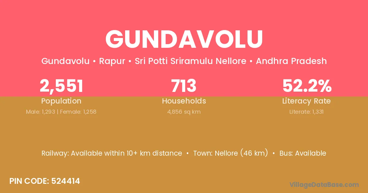 Nellore (46 km) is the nearest town to Gundavolu village for major economic activities and is located approximately 46 km away.