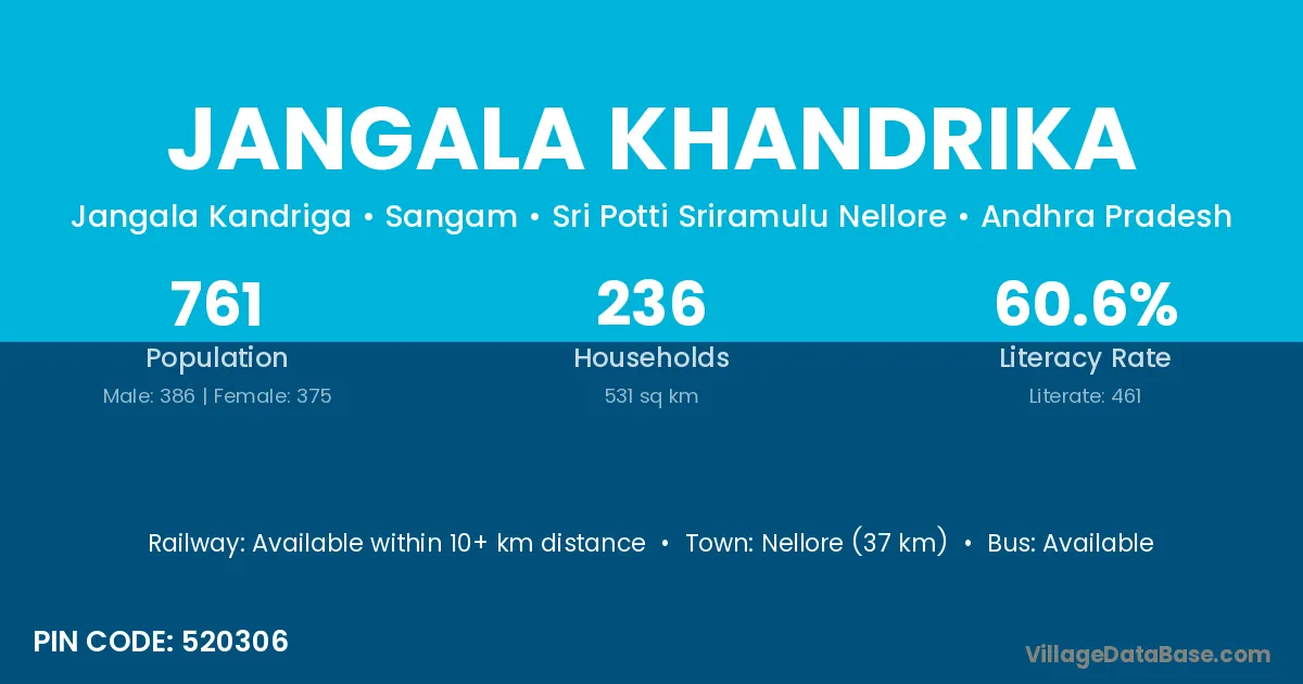 Nellore (37 km) is the nearest town to Jangala Khandrika village for major economic activities and is located approximately 37 km away.