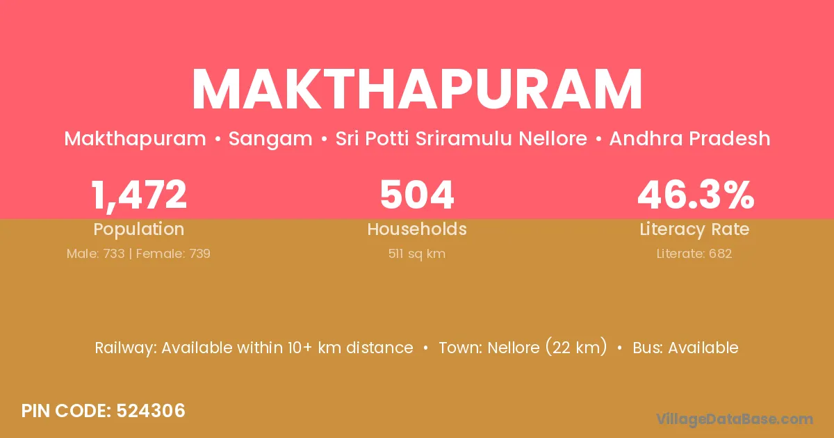 Nellore (22 km) is the nearest town to Makthapuram village for major economic activities and is located approximately 22 km away.