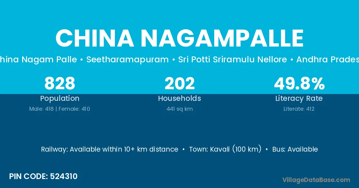 China Nagampalle village has a total population of 828 people, of which 418 are males and 410 are females.