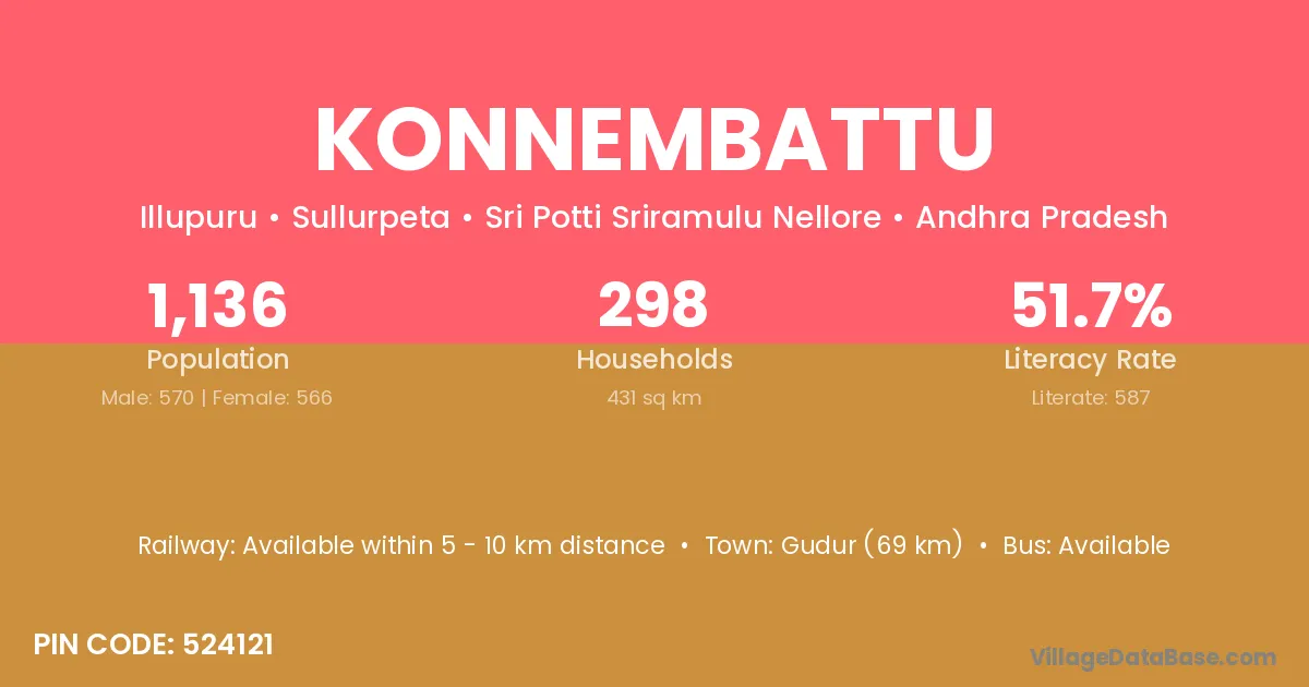 Konnembattu village has a total population of 1,136 people, of which 570 are males and 566 are females.