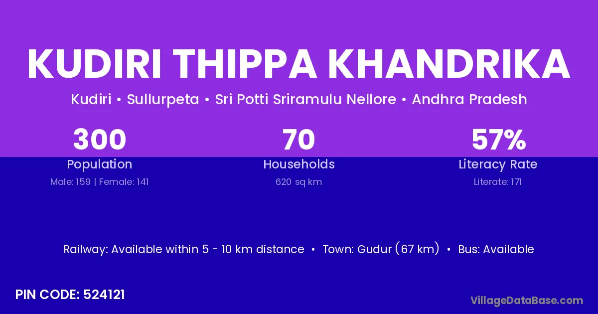 Kudiri Thippa Khandrika village has a total population of 300 people, of which 159 are males and 141 are females.