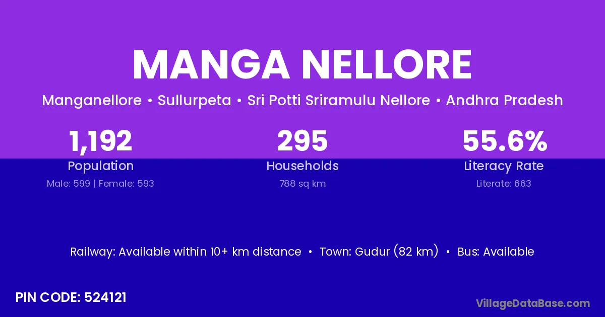 Manga Nellore village has a total population of 1,192 people, of which 599 are males and 593 are females.