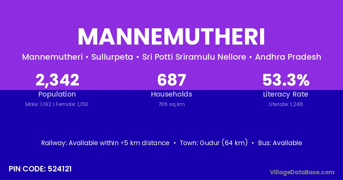Gudur (64 km) is the nearest town to Mannemutheri village for major economic activities and is located approximately 64 km away.