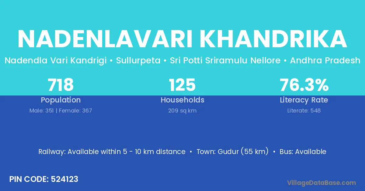 Gudur (55 km) is the nearest town to Nadenlavari Khandrika village for major economic activities and is located approximately 55 km away.