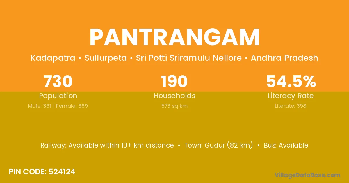 Gudur (82 km) is the nearest town to Pantrangam village for major economic activities and is located approximately 82 km away.