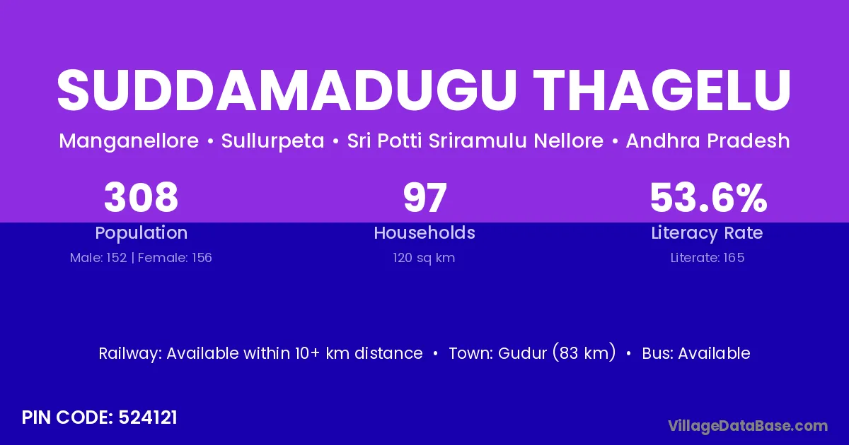 Gudur (83 km) is the nearest town to Suddamadugu Thagelu village for major economic activities and is located approximately 83 km away.