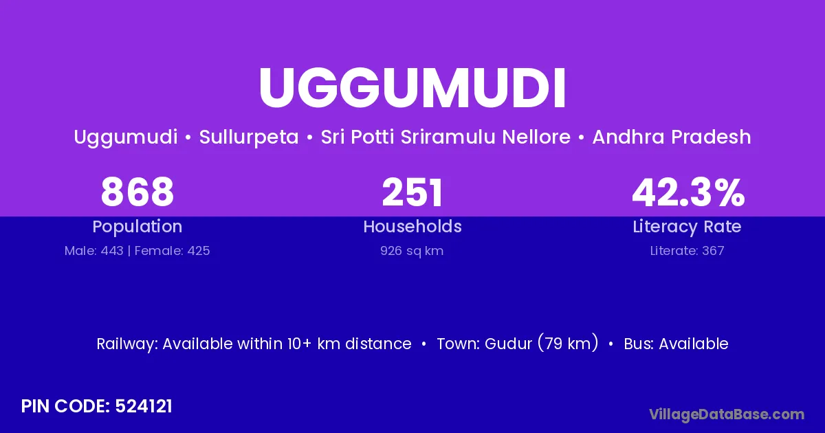 Gudur (79 km) is the nearest town to Uggumudi village for major economic activities and is located approximately 79 km away.