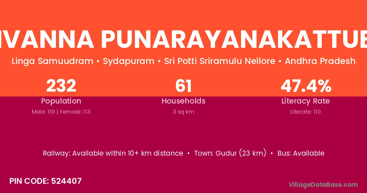 Adhvanna Punarayanakattubadi village has a total population of 232 people, of which 119 are males and 113 are females.