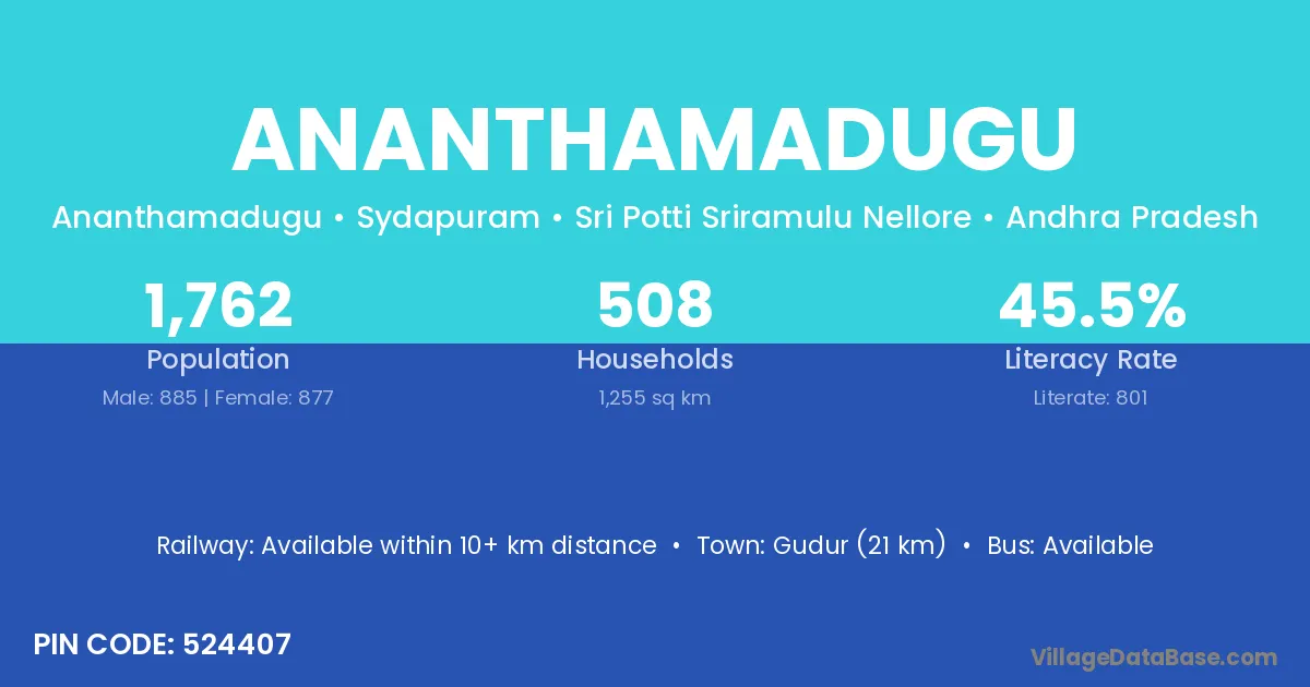Gudur (21 km) is the nearest town to Ananthamadugu village for major economic activities and is located approximately 21 km away.