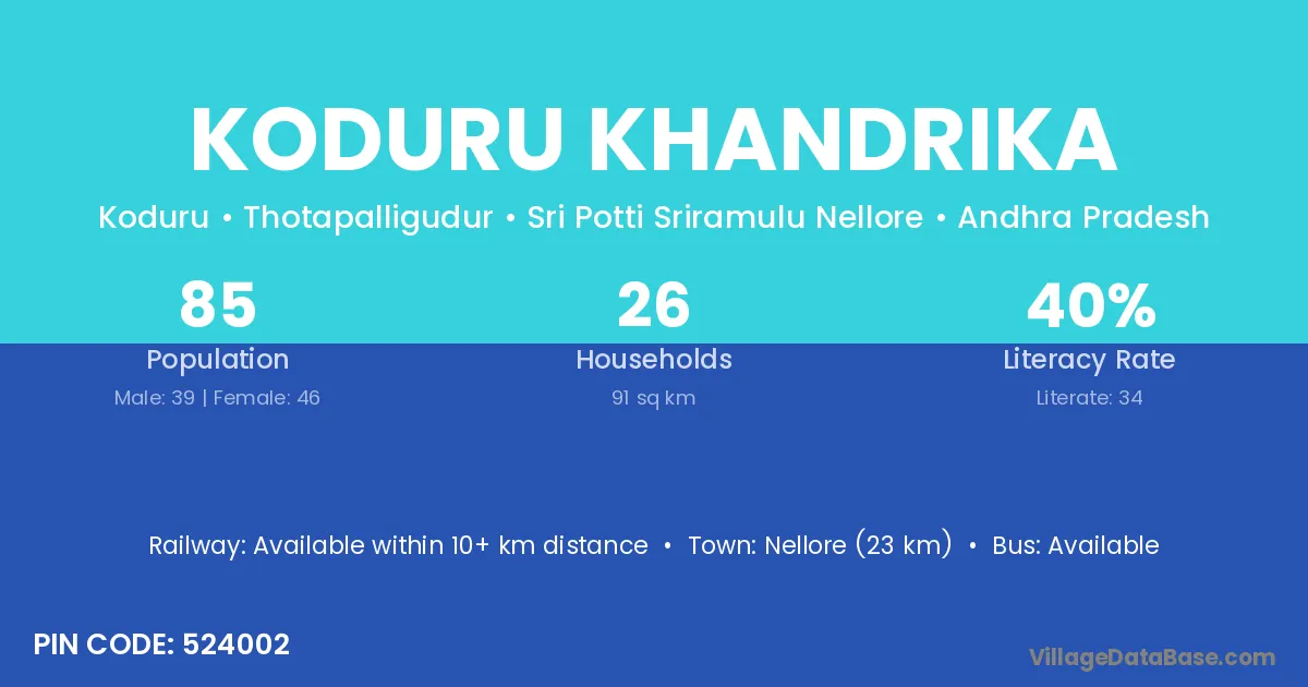 Nellore (23 km) is the nearest town to Koduru Khandrika village for major economic activities and is located approximately 23 km away.