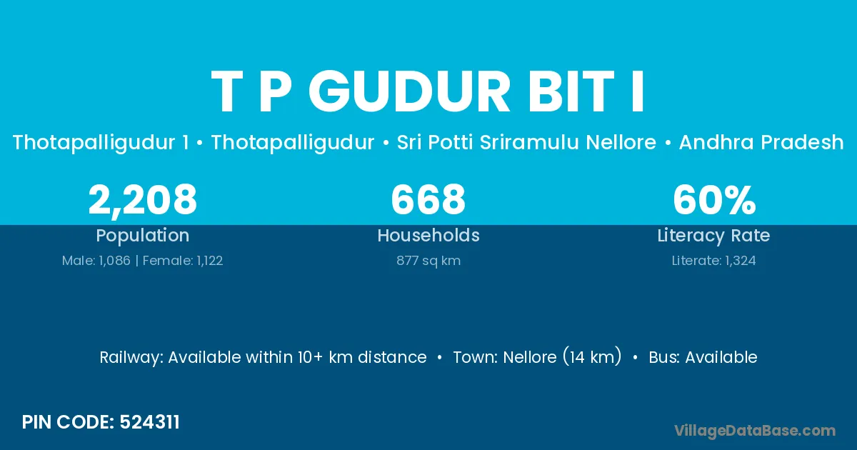 T P Gudur Bit I village has a total population of 2,208 people, of which 1,086 are males and 1,122 are females.