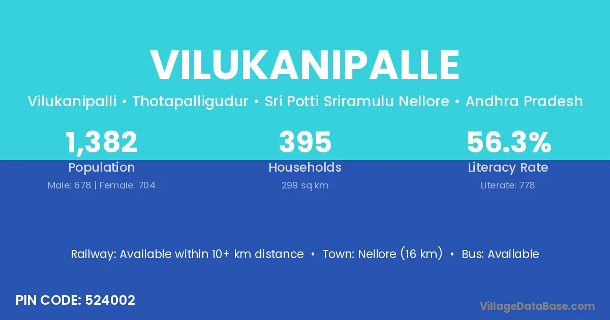 Nellore (16 km) is the nearest town to Vilukanipalle village for major economic activities and is located approximately 16 km away.