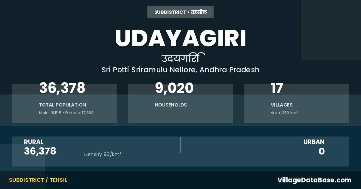 According to the 2011 census The total area of Udayagiri Mandal is 380 km², with a population of 36378 people. The population density is 96 inhabitants per square kilometre, and there are approximately 9020 houses in the sub district.